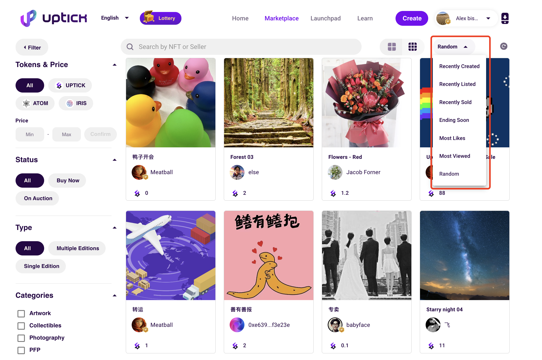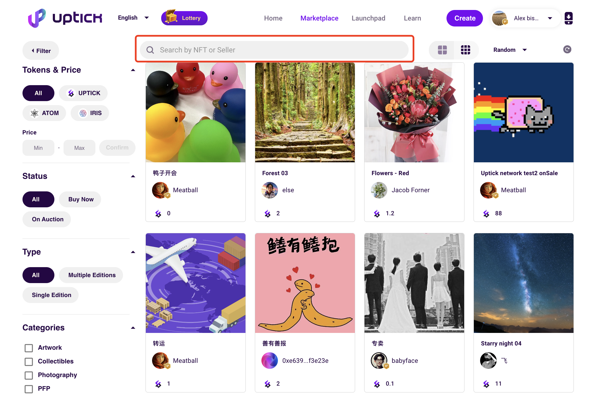 If you want to search for NFTs, you can using the NFT name, seller name, and the seller's address (starting with 0x.....) in the marketplace.