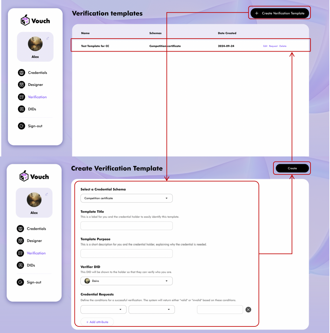 Set Credential Requests Define what constitutes a valid verification. The system will return a result as either valid or invalid. You can select multiple attributes based on the Credential Schema you choose.